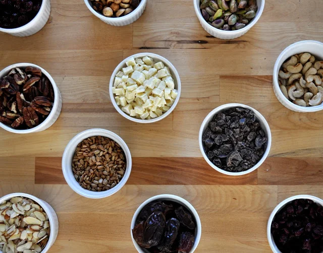 -1/4 cup roasted hazelnuts, ¼ cup roasted slices almonds, ¼ cup white chocolate, ¼ cup dried cranberries or dates